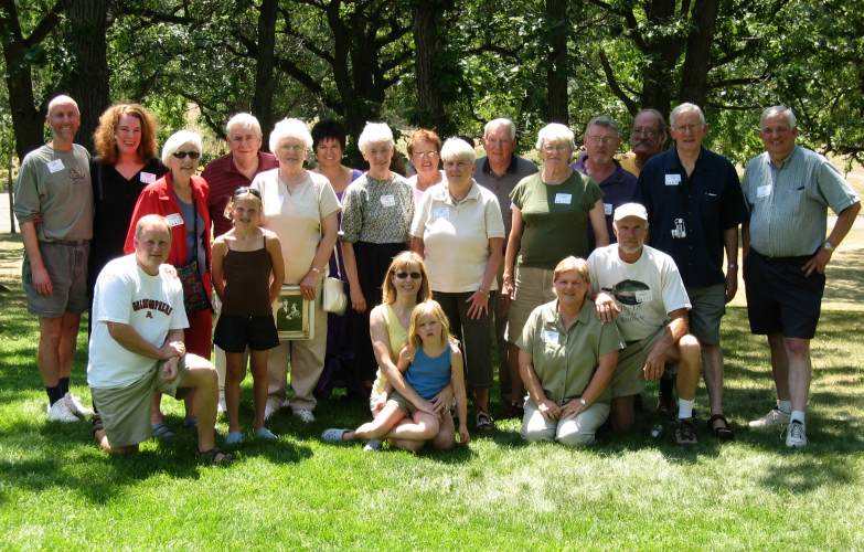 | Back row, standing left to right: | Leon Bordua, Rae Stimler Bordua, Janet Munson Deming, Jim Balder, Bertie Balder, Bonnie Kampa, Gretchen Greenwood Weber, Charlene Balder, Jane Greenwood Loper, Bernard J. Balder, Martha Greenwood Spaans, Ed Spaans, Thomas Weber, Dick Kampa, and Rick Kampa. |