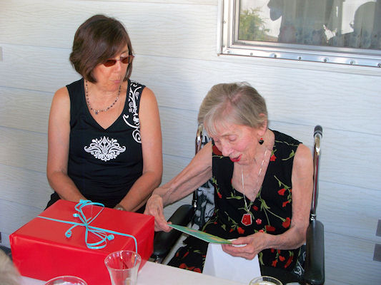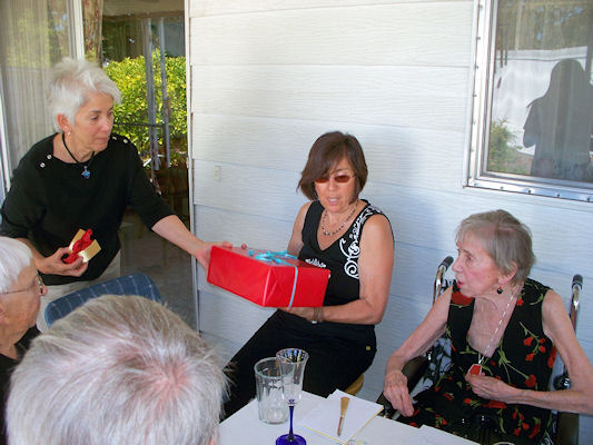 | Daughters Isabel and Jill give presents to their mother while sister Louise and nephew Jim Kirkpatrick look on | Jill watches her mother Dorothy open her birthday card |