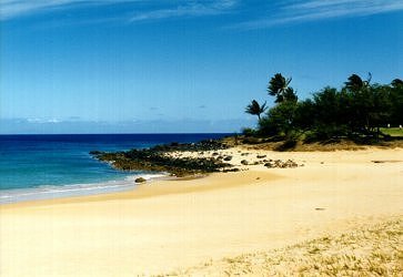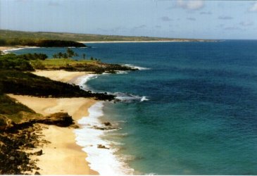 Papohaku Beach, located topside on the island's northwest coast, a few miles north of Maunaloa and the Molokai Ranch, is the perfect place for a nice, mindless walk down a deserted strand with waves rhythmically rinsing the sugary sand from between your toes. Papohaku, constantly replenished by currents and waves, is God's gift to the sandcastle architect. |