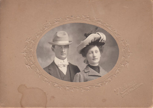 The attached picture was in a box of my Mom’s, unlabeled. The matting is stamped with the photographer’s name and location, Nelson’s, Little Falls, Minnesota. This is where my Mom was born, and points to my Roche and Kampa ancestors. There is no date, but several people have independently put an approximate date of 1905-1910 based on clothing. This is too late to be a picture of Robert Roche and Hattie Kampa, and too early to be any of their children.
