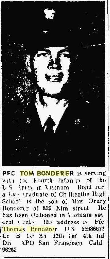 Drury Joseph Bonderer Anna "Bess" Geneva Stimmler Graduated Chillicothe High School Sergeant in U.S. Army, Light Weapons 4th Infantry Division (7 Jul 1967 to 1 May 1968) |